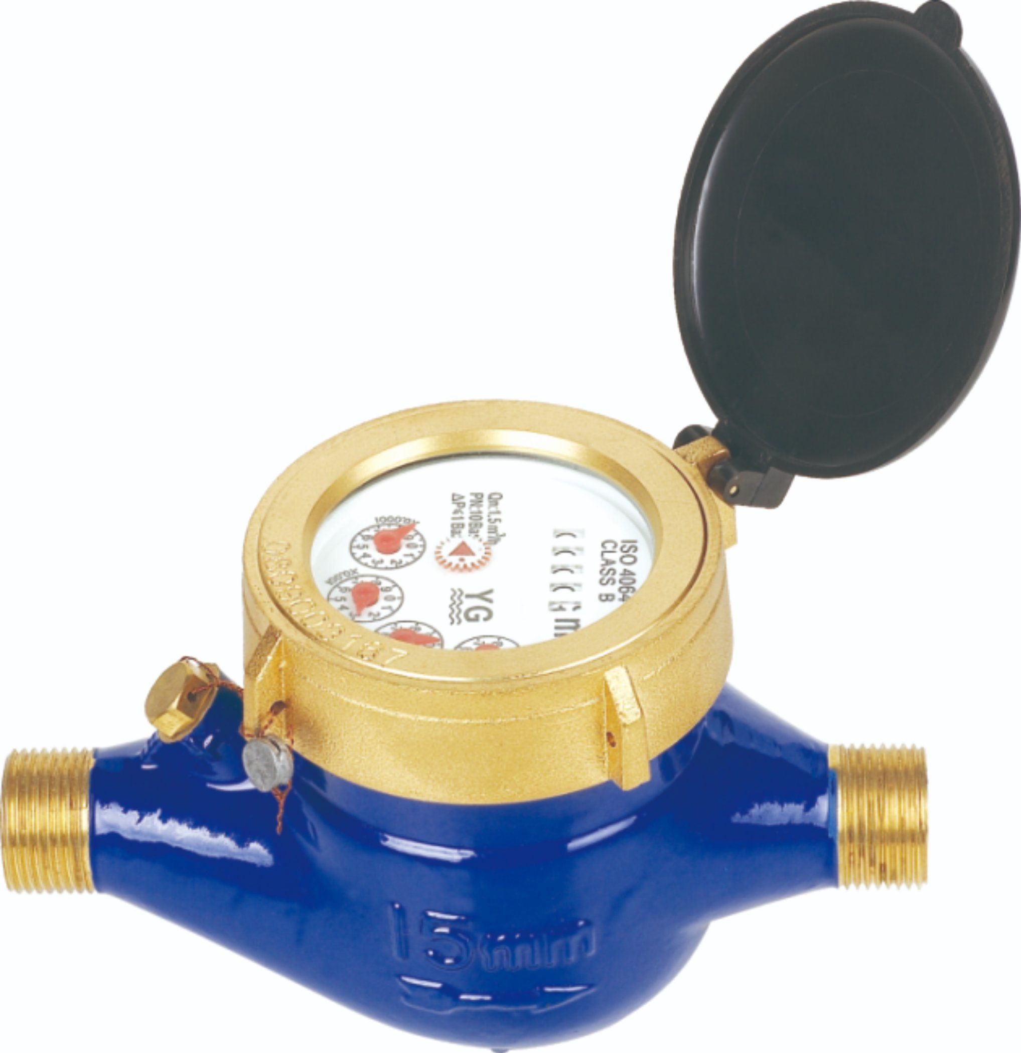 Multi jet, Dry-dialMaterial body: Brass.Sizes: DN15 to 20mm, (½" - 3/4"), Available for cold water (30°C), hot water(90°C)Accuracy: ISO 4064 Class B StandardUniversal use. Easy for interchange & maintenanceMAIN TECHNICAL DATAMeter sizeDiaDN(mm)ClassqsOverload......